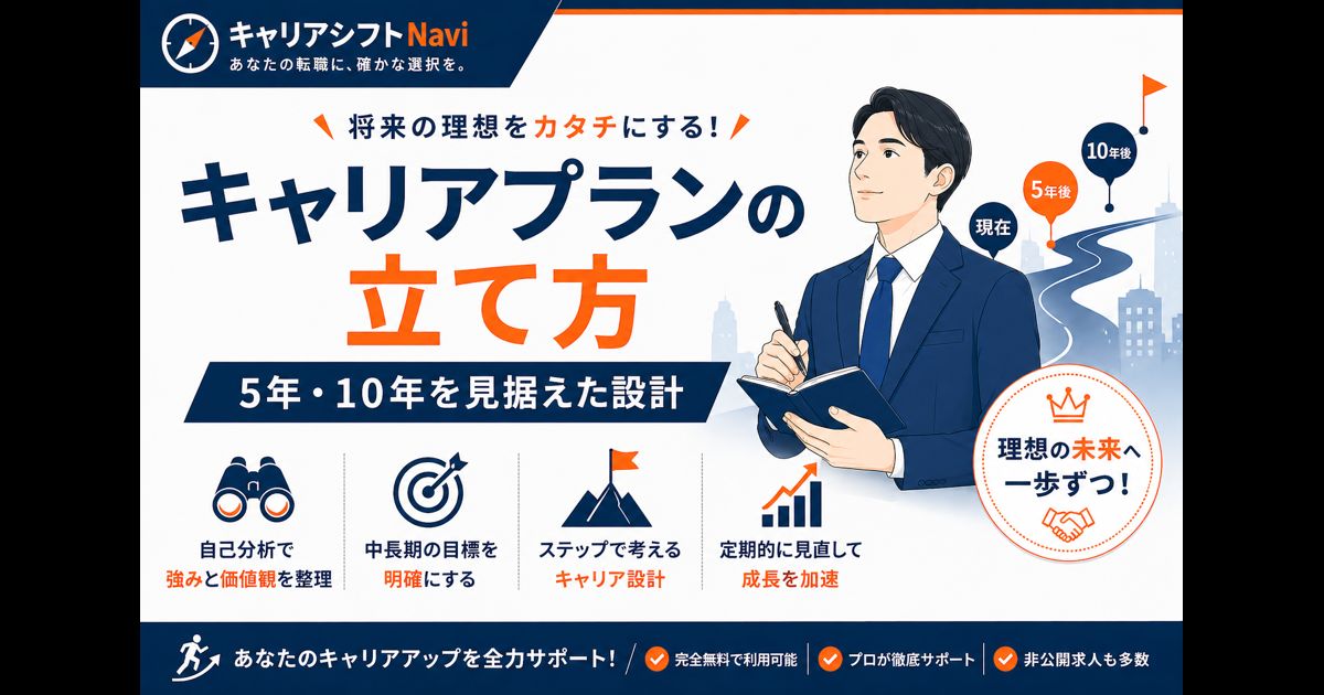 今の働き方や進路に漠然とした不安を抱えている方は少なくありません。キャリアの迷子になりやすい20代・30代だからこそ、5年単位・10年単位で自分の進路を設計することが大切です。本記事では、キャリアプランを立てるための具体的なステップ・ワークシート・よくある落とし穴をご紹介します。この記事を読めば、あなたの人生設計に基づいた現実的で実行可能なキャリアプランを作成できます。