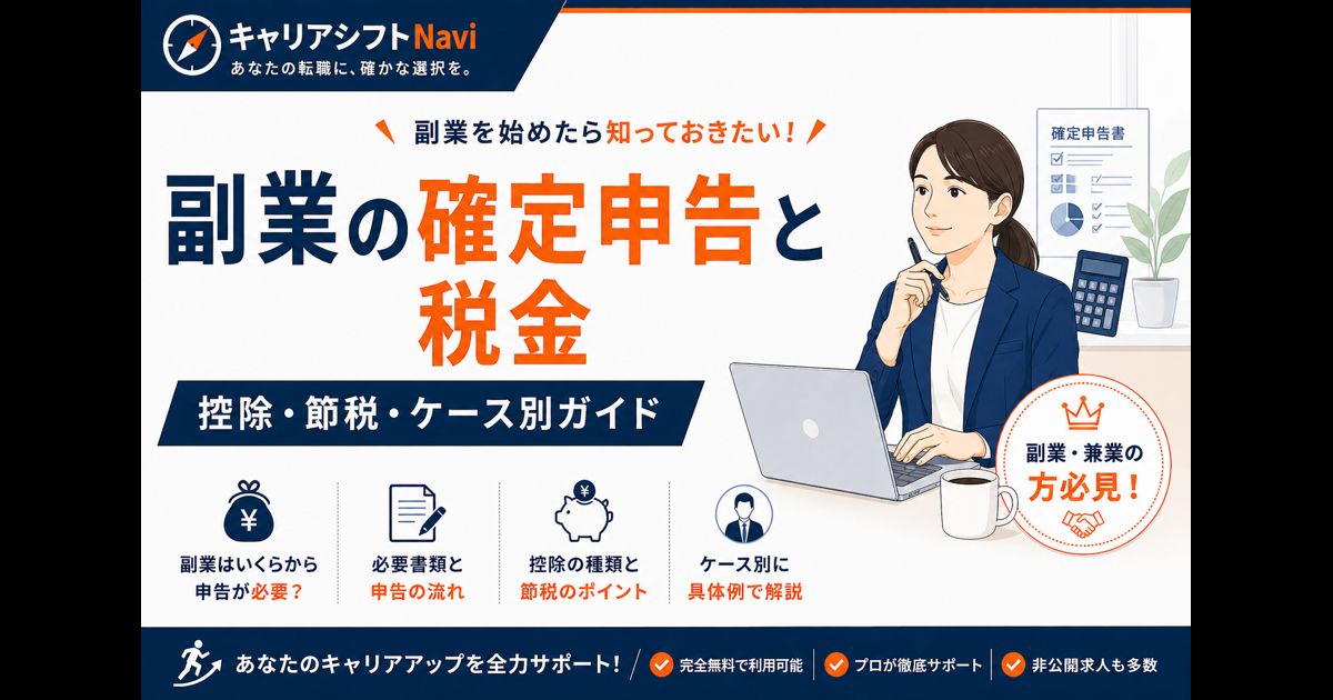 副業を始めたとき、最初に直面する課題が税金です。確定申告の要否、会社への通知、経費として認められる範囲――こうした疑問を抱えている方は少なくありません。本記事では、副業のある会社員が押さえるべき確定申告と税金の全知識を、図表や吹き出しを交えて、できるだけ分かりやすく解説します。この記事を読めば、確定申告を前に焦らず、自信を持って準備を進められます。