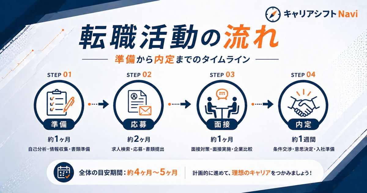 転職活動は「準備フェーズ(1ヶ月)+ 活動フェーズ(2〜5ヶ月)+ 退職調整フェーズ(1ヶ月)」の3段階で進みます。合計2〜6ヶ月が一般的な目安です。