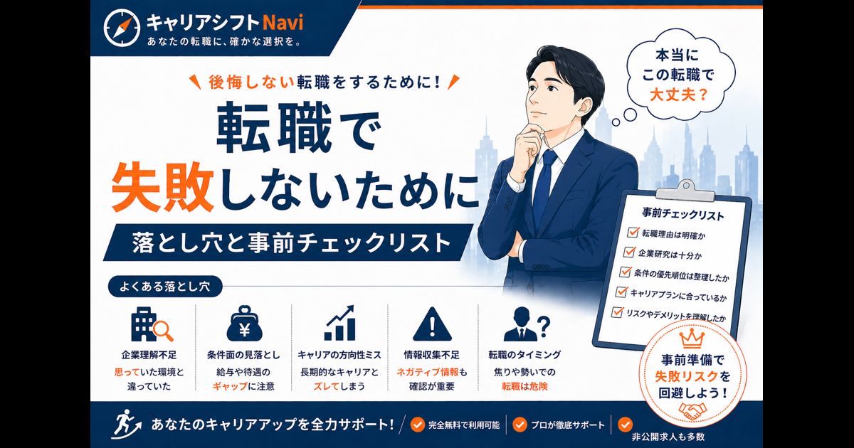 転職は人生のターニングポイントです。しかし、決断の急ぎすぎや準備不足で「前より悪い環境になってしまった」という後悔をする人は後を絶ちません。本記事では、実際に転職で失敗した人が陥りやすい落とし穴7つと、事前チェックリスト10項目を紹介します。この記事を読めば、あなたは失敗を未然に防ぎ、本当に納得できる転職先を選べるようになります。