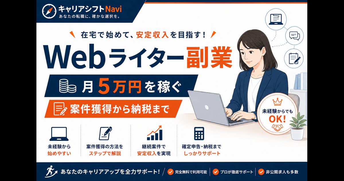 副業としてWebライターを始めたい方の多くが、最初に直面するのが「案件をどう獲得するか」という壁です。月5万円の達成は、初心者向けジャンル選びと継続案件獲得が鍵です。本記事では、初月から実践できる案件獲得戦略・単価交渉・税金対策まで、実務的なロードマップを解説します。この記事を読めば、あなたも3ヶ月以内に月5万円の達成に近づけます。